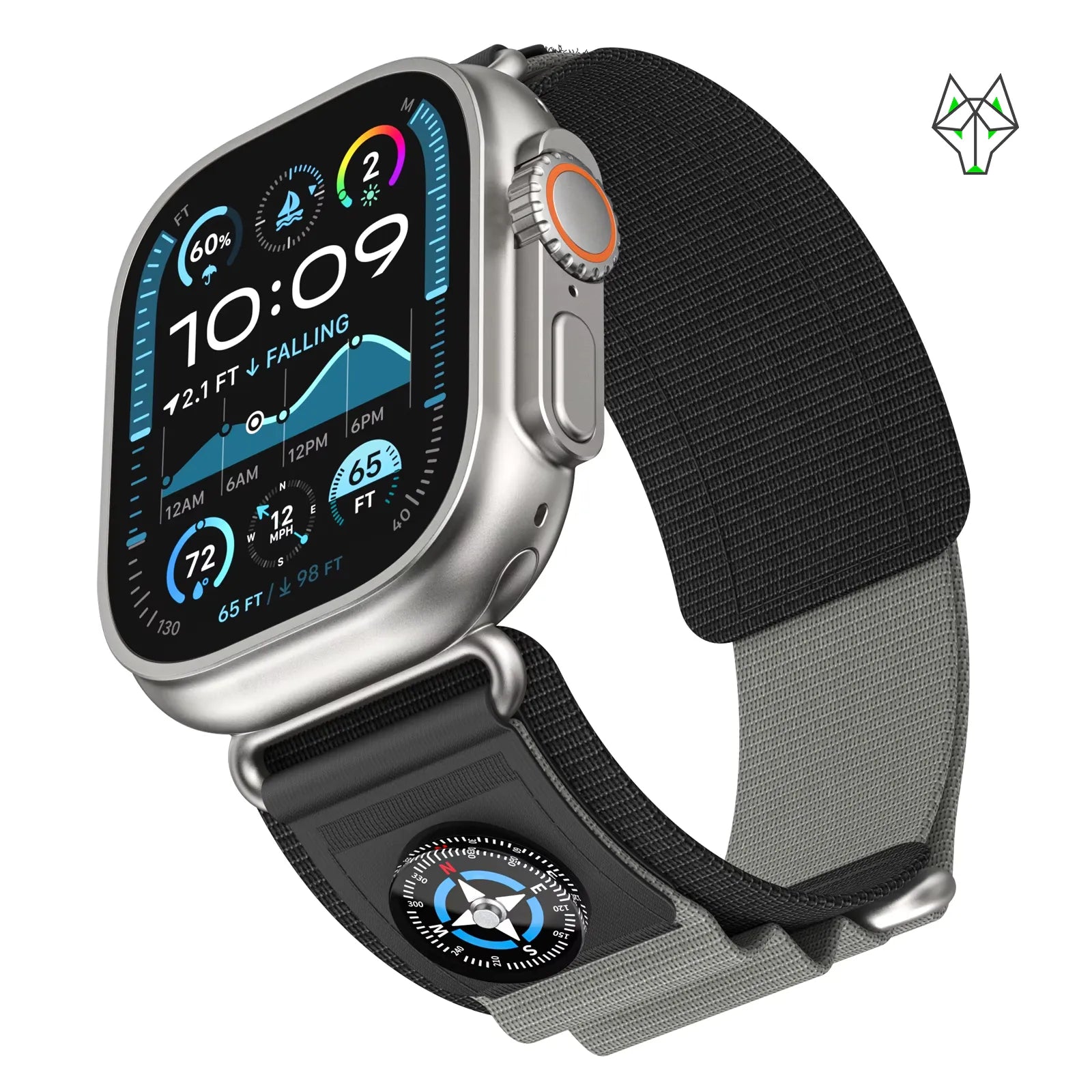 Die kompakte Kompass-Optik am oberen Segment verstärkt den Outdoor-Charakter und sorgt für einen unverwechselbaren WolfBand-Signature-Style.